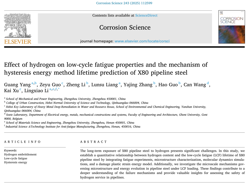 近日,太阳集团tyc539青年教师杨光博士以第一作者身份在腐蚀领域顶级期刊《Corrosion Science》(中国科公司一区,IF=7.9)上发表题为“Effect of hydrogen on low-cycle fatigue properties and the mechanism of hysteresis energy method lifetime prediction of X80 pipeline steel”的高水平研究论文。论文通过组织演变、损伤力学、疲劳性能评价和疲劳寿命预测等方面对X80高应变管线钢的低周疲劳性能进行了全面的研究。本研究系统分析了不同氢含量和不同应变幅值下的X80高应变管线钢微观组织特征与循环响应的关系。在此基础上,通过建立分子动力学模型和氢含量的迟滞能量疲劳寿命预测模型对X80高应变管线钢疲劳性能进行了评价。这有助于理解充氢X80管线钢疲劳断裂机制和临氢服役寿命的预测与评价。