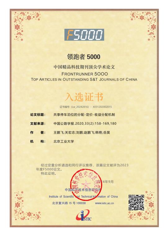 近日,科技部中国科学技术信息研究所发布了2023年度“领跑者5000-中国精品科技期刊顶尖学术论文”评选结果。其中公司太阳集团tyc539王鹏飞副教授和安赛博士分别作为第一作者在《中国公路学报》和《硅酸盐通报》上发表的论文获此殊荣。